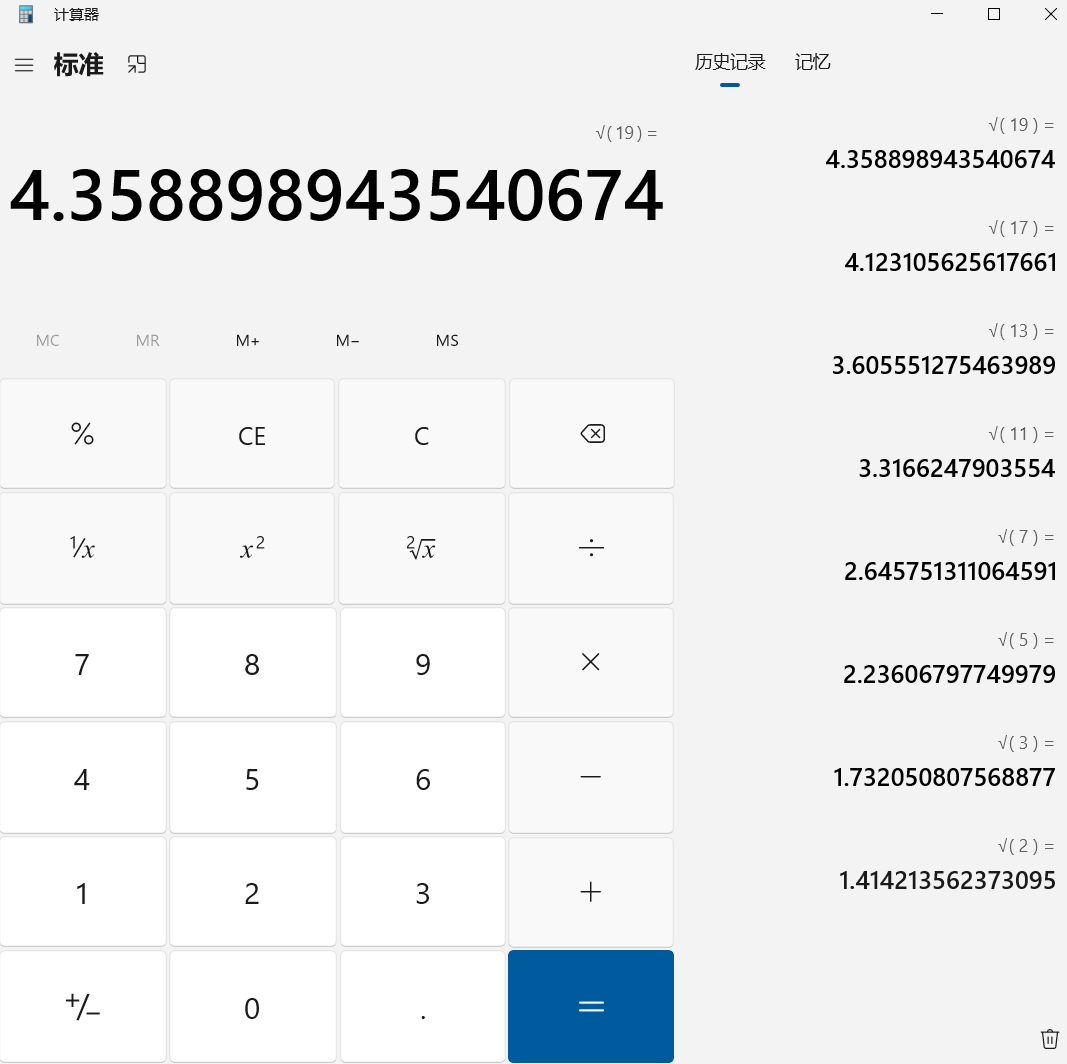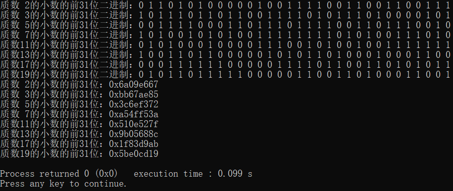 {double decimals[8] = {0.414213562373095,0.732050807568877,0.23606797749979,0.645751311064591,0.3166247903554,0.605551275463989,0.123105625617661,0.358898943540674,};unsigned short prime_arrays[8] = { 2, 3, 5, 7, 11, 13, 17, 19 };unsigned short weight_arrays[8][32] = {0};unsigned short i = 0, j = 0;unsigned long result[8] = { 0 };for (j = 0; j < 8; ++j) {for (i = 0; i < 32; ++i) {decimals[j] *= 2;if (decimals[j] > 1) {weight_arrays[j][i] = 1;decimals[j] -= 1;} else {weight_arrays[j][i] = 0;}}printf("质数%2d的小数的前31位二进制:", prime_arrays[j]);for (i = 0; i < 32; ++i) {printf("%d ", weight_arrays[j][i]);}printf("\n");}for (j = 0; j < 8; ++j) {for (i = 0; i < 32; ++i) {result[j] += weight_arrays[j][i] << (31 - i);}printf("质数%2d的小数的前31位:", prime_arrays[j]);printf("%#x\n", result[j]);}return 0;