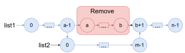 请你将 list1 中下标从 a 到 b 的全部节点都删除,并将list2 接在被删除节点的位置。