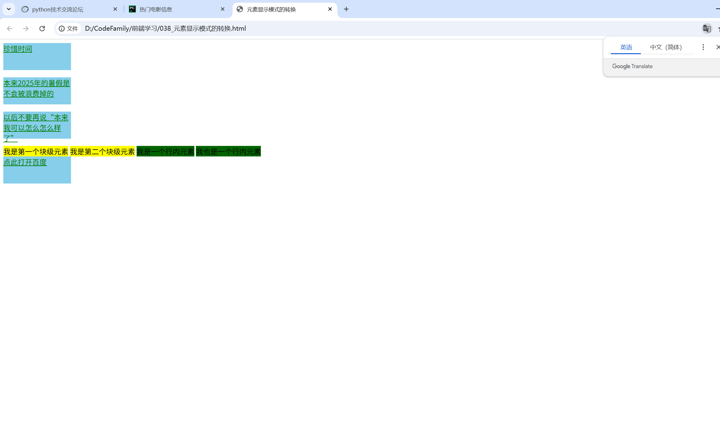 </head><body><a href="#">珍惜时间</a><p><a href="#">本来2025年的暑假是不会被浪费掉的</a></p><p><a href="#">以后不要再说“本来我可以怎么怎么样了”</a></p><div>我是第一个块级元素</div><div>我是第二个块级元素</div><span>我是一个行内元素</span><span>我也是一个行内元素</span><a href="https://www.baidu.com">点此打开百度</a>