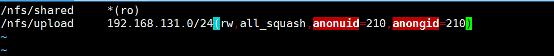 /nfs/upload 192.168.131.0/24(rw,all_squash,anonuid=210,anongid=210)