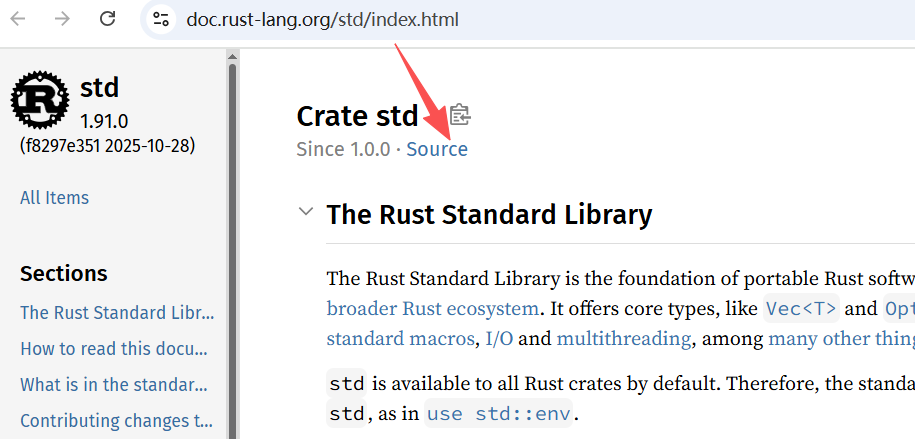 core库是 std 的子集(无 I/O 和多线程),适用于嵌入式等无操作系统环境;alloc库仅提供内存分配能力。 - 文档查阅技巧:使用官网文档顶部的搜索框快速定位API;熟悉模块结构后,可点击“Summary”切换精简视图;通过“Source”链接查看标准库源码(高质量实现值得学习)。