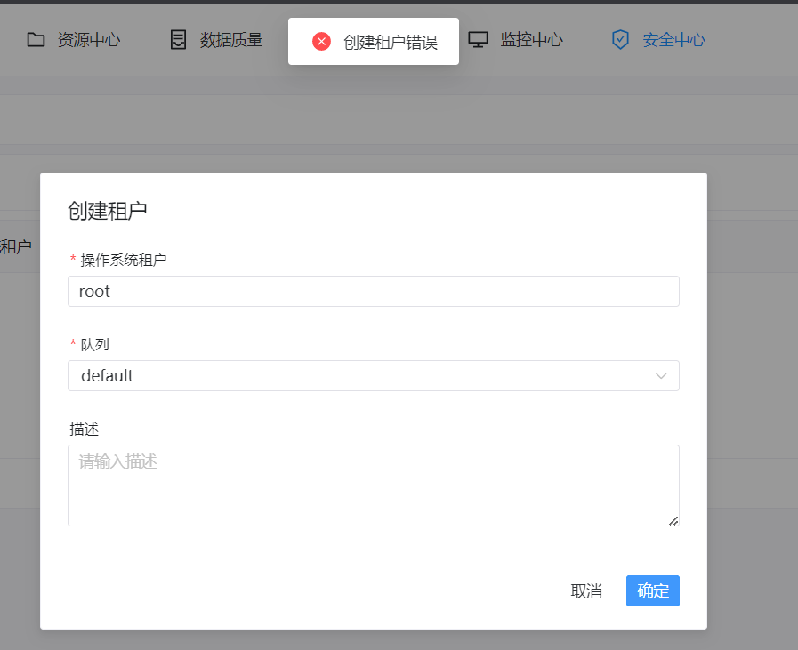 调度器创建租户错误的原因是hdfs上面处于安全模式,在安全模式下,hdfs里面是只读的,而海豚调度器,是要创建租户,所以才会出现这个错误。