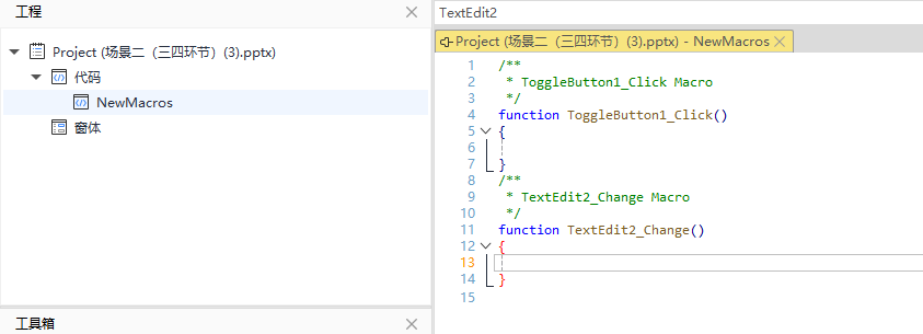 首先我们打开WPS开发工具,找到按钮和文本框,在页面添加文本框,然后点击文本框和按钮就会跳转宏编译器,并且显示两个函数