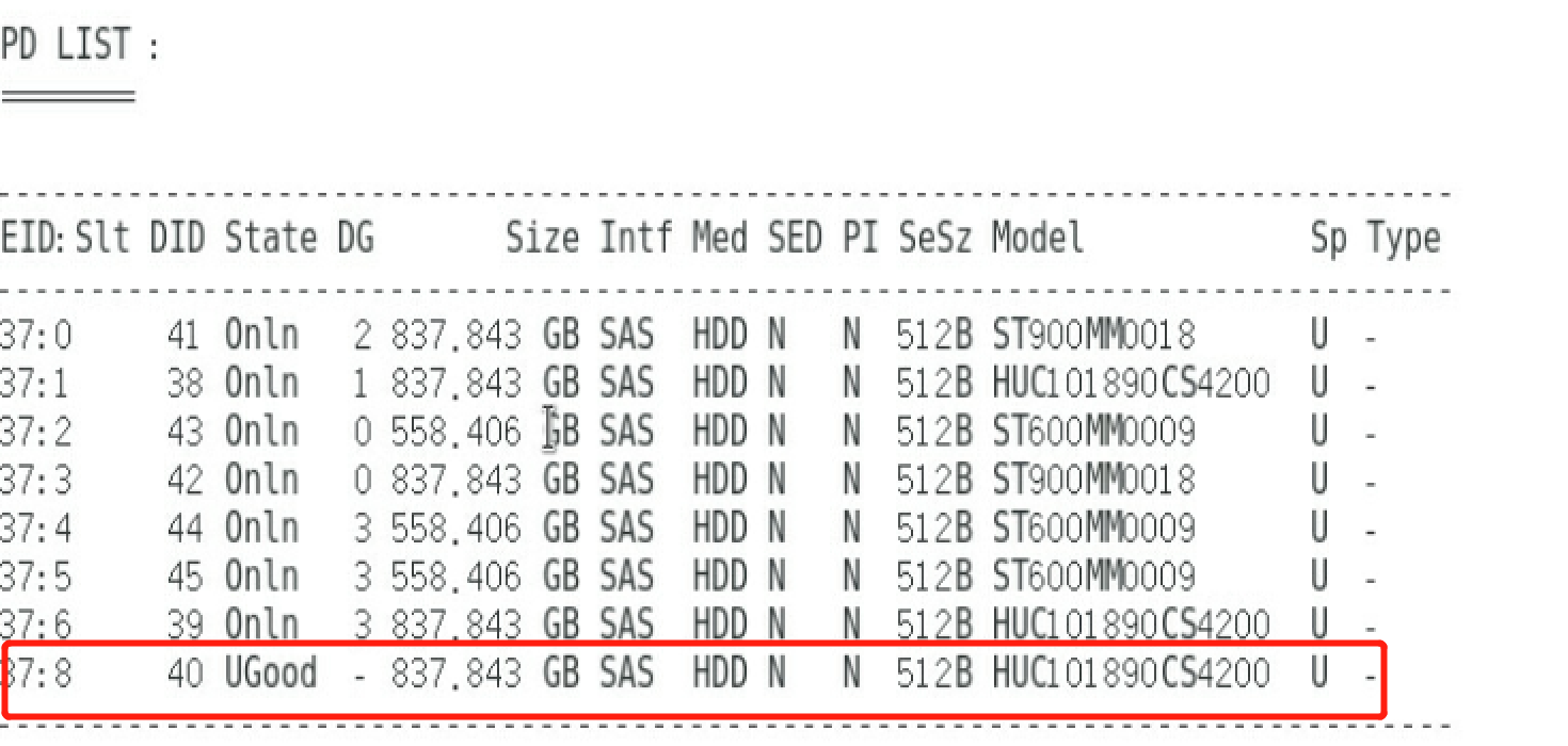 目前已有四块盘做了阵列,EID:SLT对应着硬盘的标识,如下所示。