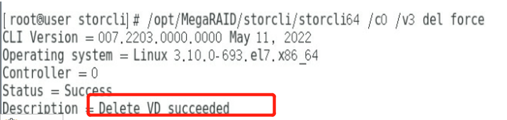 raid_id:待删除RAID的ID,可通过./storcli64 /c0/vall show查看RAID的id值。配置为all时删除全部RAID。使用命令/opt/MegaRAID/storcli/storcli64 /c0 /v3 del force,将raid5(vd3)删除,如下所示: