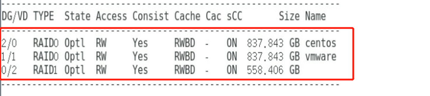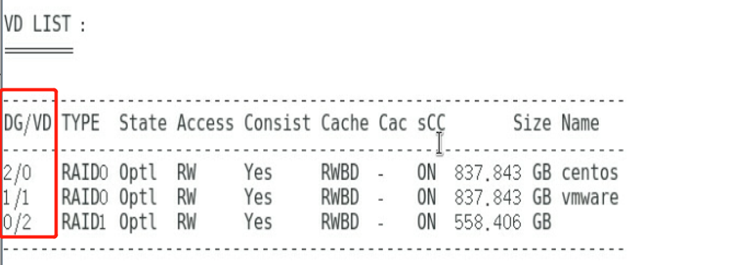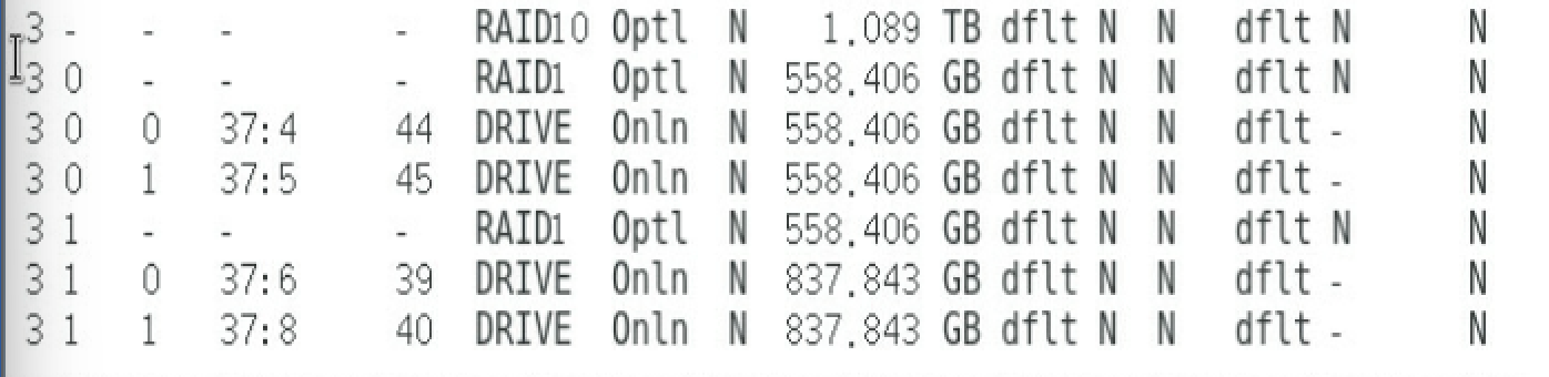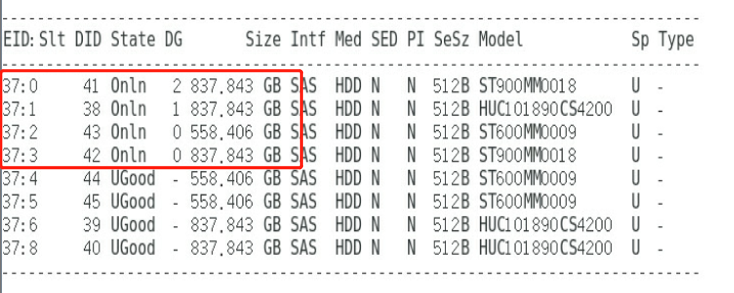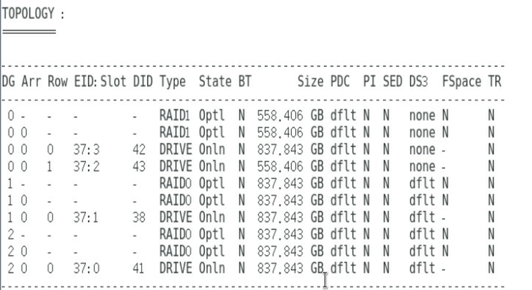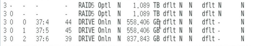 如下所示可以看到每个raid里面对应的物理硬盘的详细信息,例如raid1下的物理硬盘是37:3和37:2,dg1号raid0下的物理硬盘是37:1,dg2号raid0下的物理硬盘是37:0.