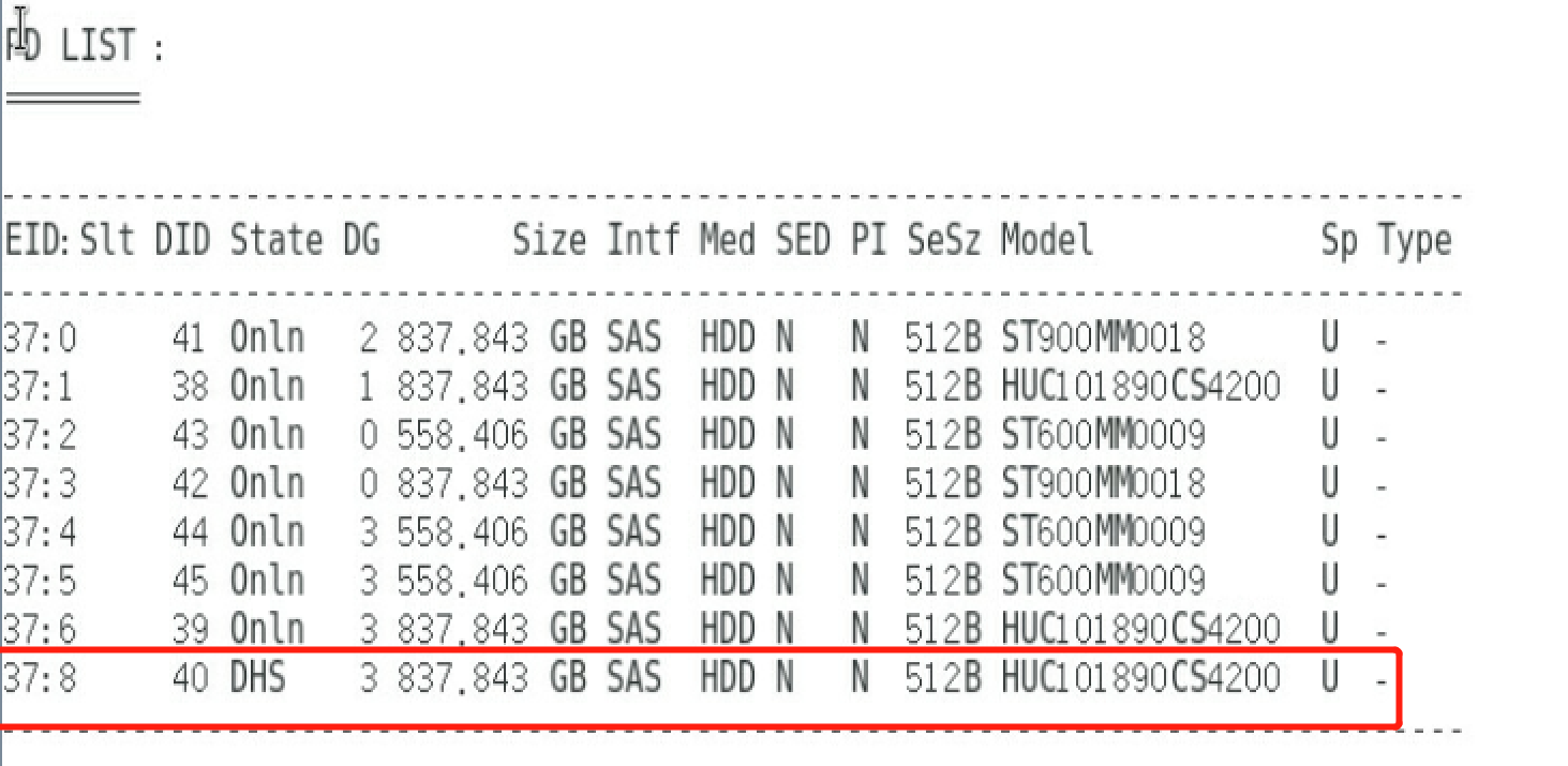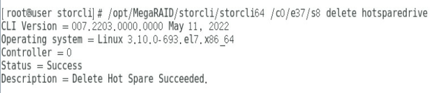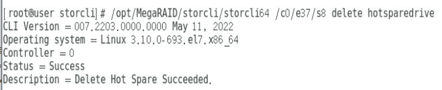 使用命令 /opt/MegaRAID/storcli/storcli64 /c0/e37/s8 delete hotsparedrive,将37:8号盘设置为全局热备盘,如下所示: