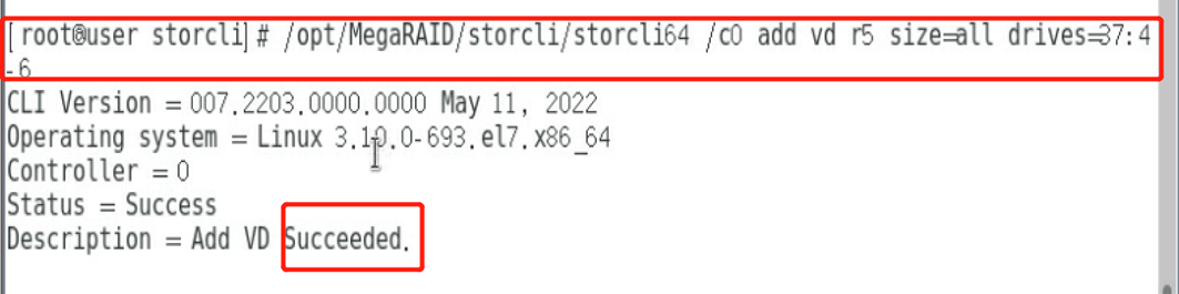 使用命令/opt/MegaRAID/storcli/storcli64 /c0 add vd r5 size=all drives=37:4-6,将37:4到6这四块盘的所有容量,设置为0号阵列卡下的raid5,如下所示: