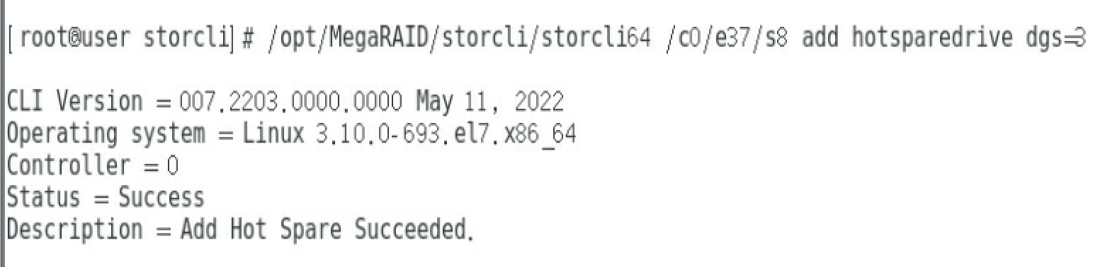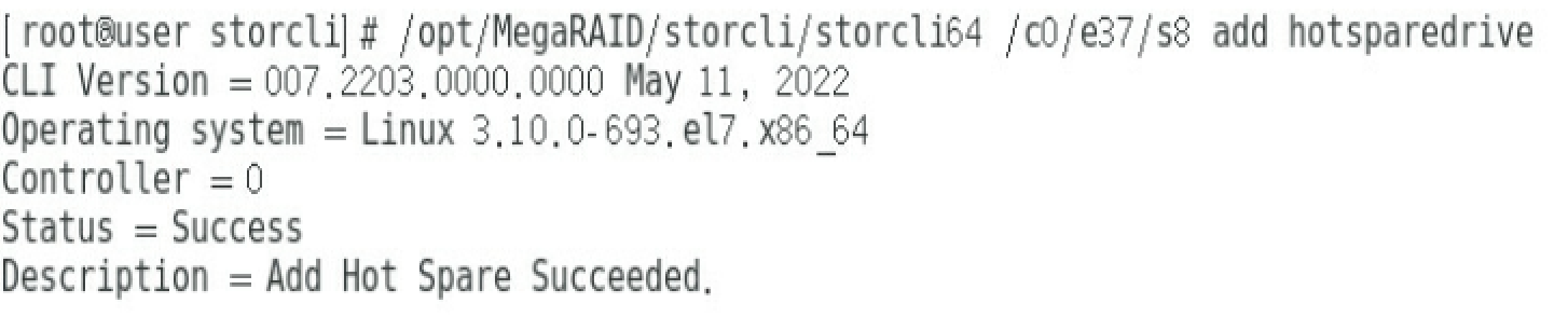 使用命令/opt/MegaRAID/storcli/storcli64 /c0/e37/s8 add hotsparedrive,将37:8号盘设置为全局热备盘,如下所示: