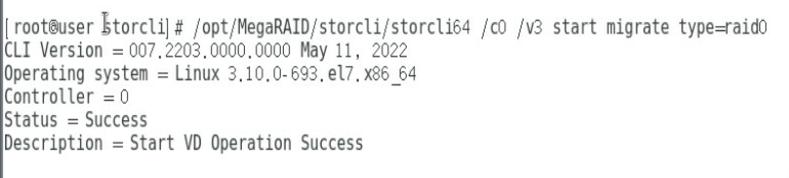 【命令】storcli64 /ccontroller_id/vraid_id start migrate type=raidx option=operation drives= vd_drives force【参数】controller_id:存储控制卡ID,单卡默认为0,多卡以storcli64 /call show命令实际查询结果为准。raid_id:待扩容的RAID ID。raidx:目标RAID级别。vd_drives :选择成员盘,格式为enclosure_id:slot_id,enclosure_id为所在Enclosure的id,slot_id为目标成员盘的slot id。operation :选择增加或移除成员盘,可选add或remove。使用命令/opt/MegaRAID/storcli/storcli64 /c0 /v3 start migrate type=raid0 ,将raid5迁移为raid0