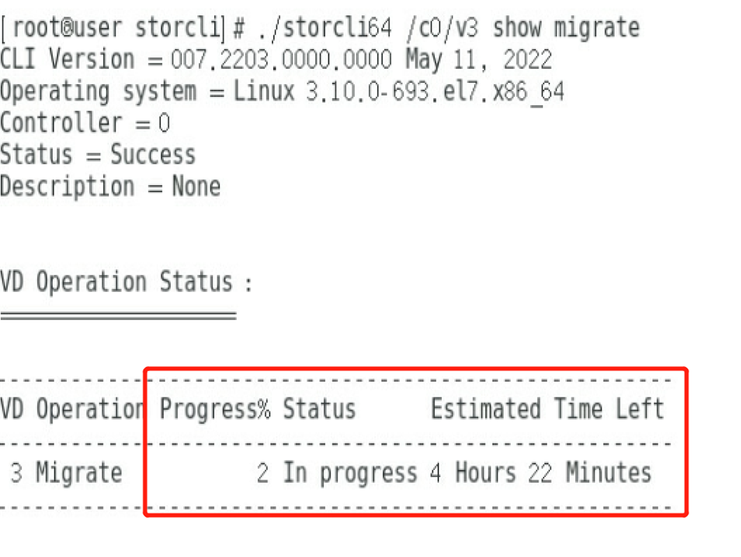 使用命令./storcli64 /c0/v3 show migrate,查看迁移进度