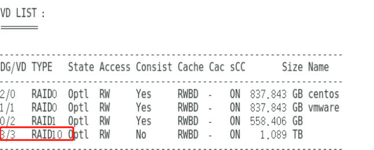 使用命令opt/MegaRAID/storcli/storcli64 /c0 add vd r10 size=all drives=37:4-6,8 pdperarray=2,创建raid10