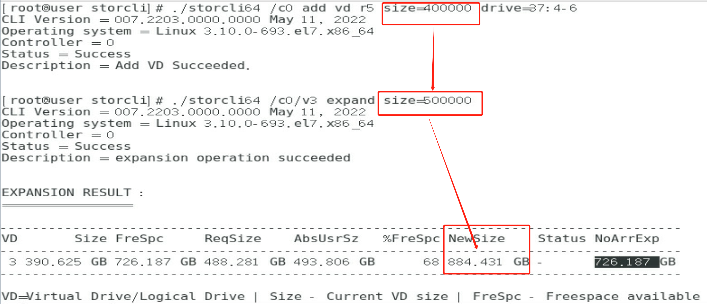 【命令】storcli64 /ccontroller_id/vraid_id expand size=target_size【参数】controller_id:存储控制卡ID,单卡默认为0,多卡以storcli64 /call show命令实际查询结果为准。raid_id:待扩容的RAID ID。target_size:待设置的容量值。使用./storcli64 /c2/v3 expand size=500000,为逻辑盘3扩容大概500G空间,如下所示