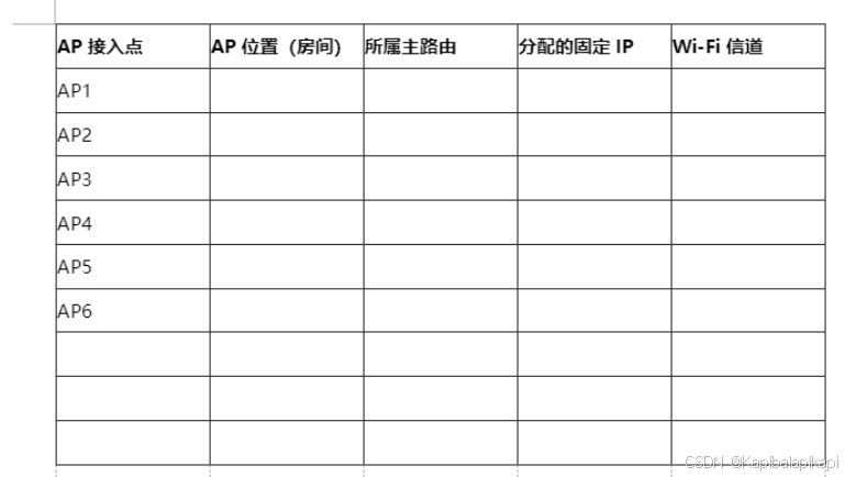 - 每个AP的物理位置、所属网络、IP地址、Wi-Fi信道;