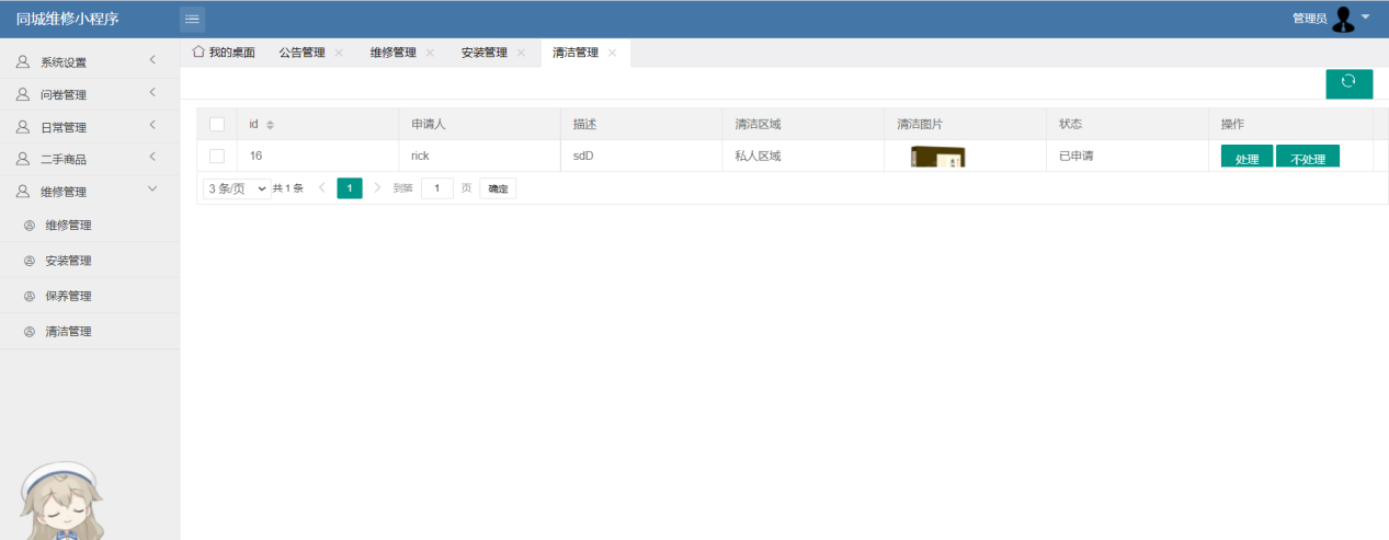 管理员可进行维修管理、安装管理、保养管理以及清洁管理。