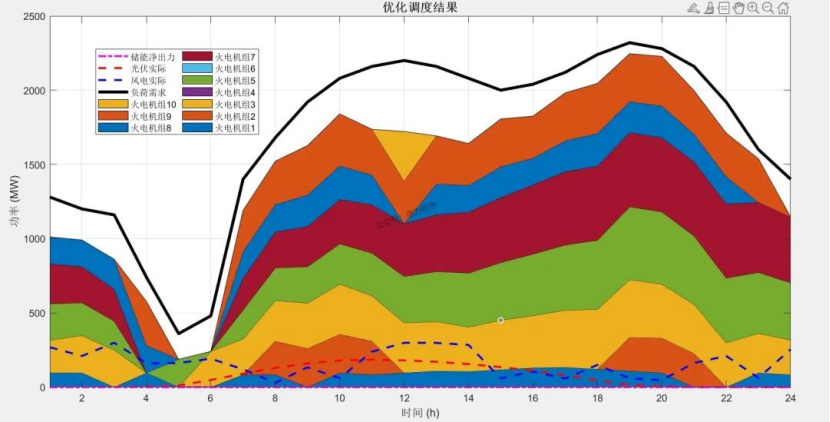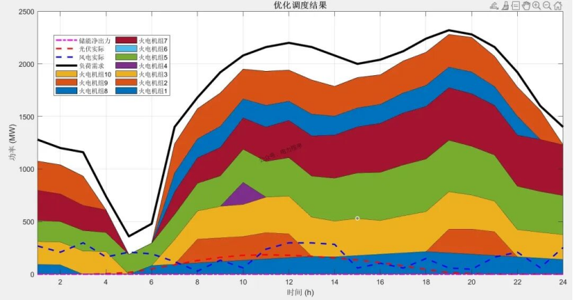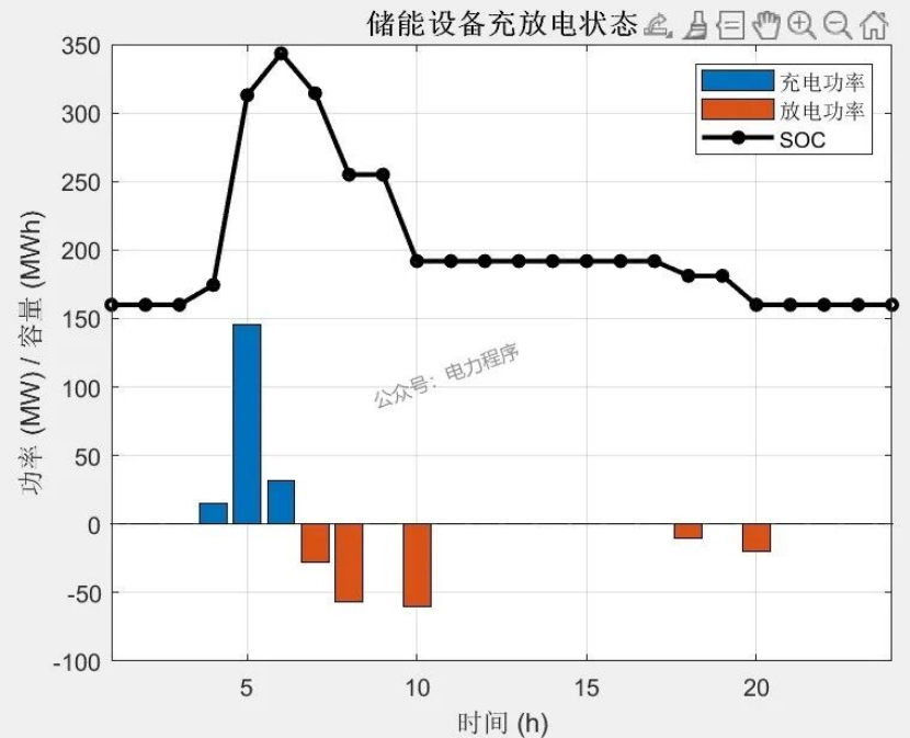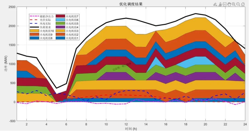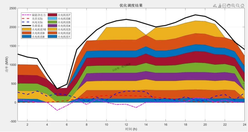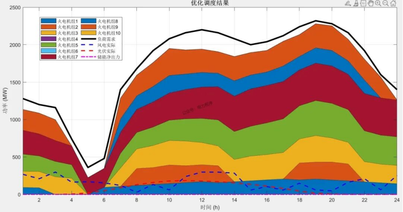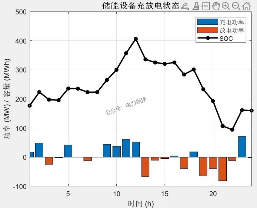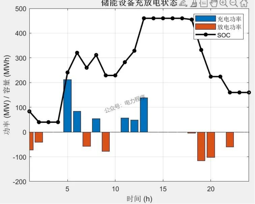 % 8.1 结果图 figure; plot(1:T, Load_forecast, 'k-', 'LineWidth', 2); hold on; plot(1:T, Pw_forecast, 'b-', 'LineWidth', 2); plot(1:T, Ppv_forecast, 'r-', 'LineWidth', 2); plot(1:T, Pw_forecast + Ppv_forecast, 'g--', 'LineWidth', 2); legend('负荷预测', '风电预测', '光伏预测', '新能源总预测', 'Location', 'northeast'); title('负荷和新能源出力预测值', 'FontSize', 12, 'FontWeight', 'bold'); xlabel('时间 (h)'); ylabel('功率 (MW)'); grid on; xlim([1,24]); % 8.2 优化调度结果图 figure; area(1:T, Pg_opt', 'LineWidth', 0.5); hold on; plot(1:T, Load_forecast, 'k-', 'LineWidth', 3); plot(1:T, Pw_forecast - Pw_cur_opt, 'b--', 'LineWidth', 2); plot(1:T, Ppv_forecast - Ppv_cur_opt, 'r--', 'LineWidth', 2); plot(1:T, P_dis_opt - P_ch_opt, 'm-.', 'LineWidth', 2); legend('火电机组1', '火电机组2', '火电机组3', '火电机组4', '火电机组5', ... '火电机组6', '火电机组7', '火电机组8', '火电机组9', '火电机组10', ... '负荷需求', '风电实际', '光伏实际', '储能净出力', ... 'Location', 'eastoutside', 'NumColumns', 2); title('优化调度结果', 'FontSize', 12, 'FontWeight', 'bold'); xlabel('时间 (h)'); ylabel('功率 (MW)'); grid on; xlim([1,24]); % 8.3 储能设备充放电柱状图(文献图7) figure; bar_data = [P_ch_opt; -P_dis_opt]'; % 充电为正,放电为负 bar(1:T, bar_data, 'stacked'); hold on; plot(1:T, S_opt, 'k-o', 'LineWidth', 2, 'MarkerSize', 4); legend('充电功率', '放电功率', 'SOC', 'Location', 'northeast'); title('储能设备充放电状态', 'FontSize', 12, 'FontWeight', 'bold'); xlabel('时间 (h)'); ylabel('功率 (MW) / 容量 (MWh)'); grid on; xlim([1,24]); % 8.4 成本构成分析 figure; costs = [cost_gen_val, cost_start_stop_val, cost_curtailment_val, ... cost_reserve_val, cost_storage_val, cost_carbon_val]; labels = {'火电成本', '启停成本', '弃电成本', '备用成本', '储能成本', '碳交易成本'}; pie(costs, labels); title('系统运行成本构成 (万元)', 'FontSize', 12, 'FontWeight', 'bold'); % sgtitle('考虑N-1准则的分布鲁棒机会约束低碳经济调度', 'FontSize', 14, 'FontWeight', 'bold'); % 支路潮流迭代 figure; lineStyles = {'-', '--', ':', '-.'}; % 线形集合 nStyles = length(lineStyles); for i = 1:k styleIdx = mod(i-1, nStyles) + 1; label = sprintf('第%d次迭代', i); y_data = squeeze(P_branchc(i,5,:)); % 若结果为1×1×n,转换后为1×n(行向量) % 或用 y_data = P_branchc(i,5,:)(:); % 转换为n×1(列向量),不影响绘图 plot(abs(y_data), ['b' lineStyles{styleIdx}], ... 'LineWidth', 1, ... 'DisplayName', label); hold on; end % plot(P_branch_max.*ones(1,24),'r--'); legend('Location', 'best'); grid on; %% ========================== 9. 结果显示 ========================== fprintf('\n=== 优化结果汇总 ===\n'); fprintf('总运行成本: %.3f 万元\n', total_cost); fprintf('火电成本: %.3f 万元\n', cost_gen_val); fprintf('启停成本: %.3f 万元\n', cost_start_stop_val); fprintf('弃风弃光成本: %.3f 万元\n', cost_curtailment_val); fprintf('备用成本: %.3f 万元\n', cost_reserve_val); fprintf('储能折旧成本: %.3f 万元\n', cost_storage_val); fprintf('碳交易成本: %.3f 万元\n', cost_carbon_val); fprintf('实际碳排放量: %.2f t\n', E_actual); fprintf('总弃风弃光量: %.2f MW\n', curtail_total);