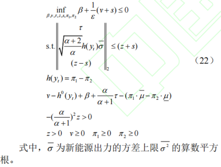 通过定义对偶变量(beta、v、s等),结合新能源出力的均值-方差模糊集参数,将概率性功率平衡约束转化为可求解的确定性约束。核心实现文献公式,包括CVaR风险度量约束(控制极端场景损失)、二阶锥约束及均值边界约束,以应对风光不确定性,在保证高置信度供电的同时,允许小概率功率不平衡。