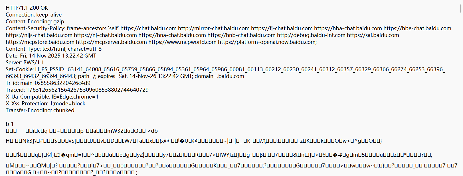 - 右侧下方显示了 HTTP 响应的报文内容. (切换到 Raw 标签页可以看到详细的数据格式)