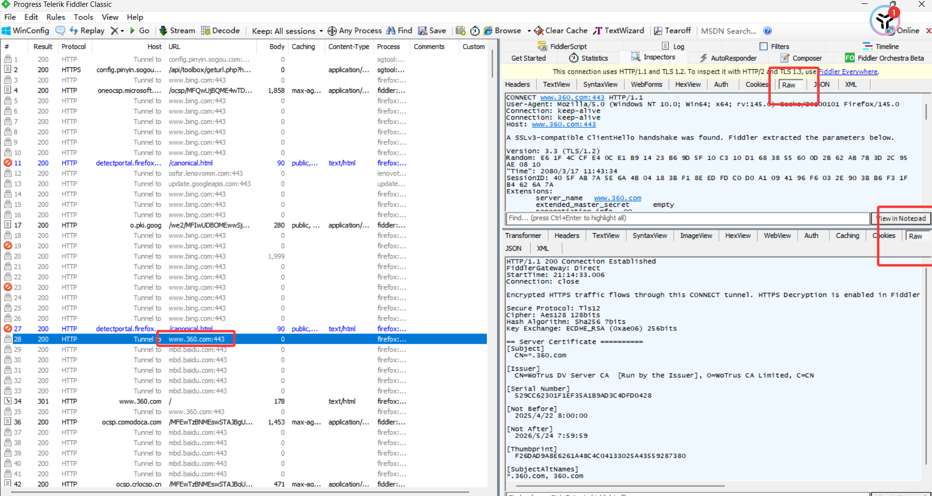 - 左侧窗口显示了所有的 HTTP请求/响应, 可以选中某个请求查看详情.