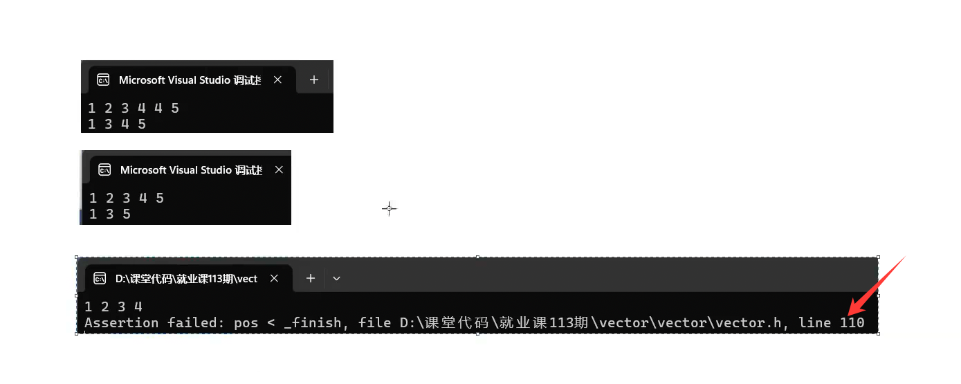 第一个先挪动然后++ 就把第二个4跳过了,连续的偶数就不行,第三个挪动覆盖2后,然后++,finish--,删除4 it又会加加,但是erase同时会导致finish--,it不会等于end,然后就断言错误,