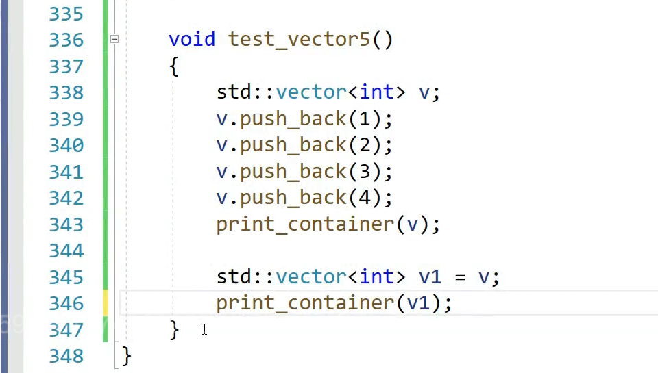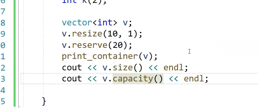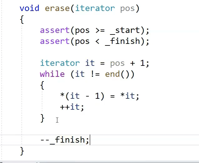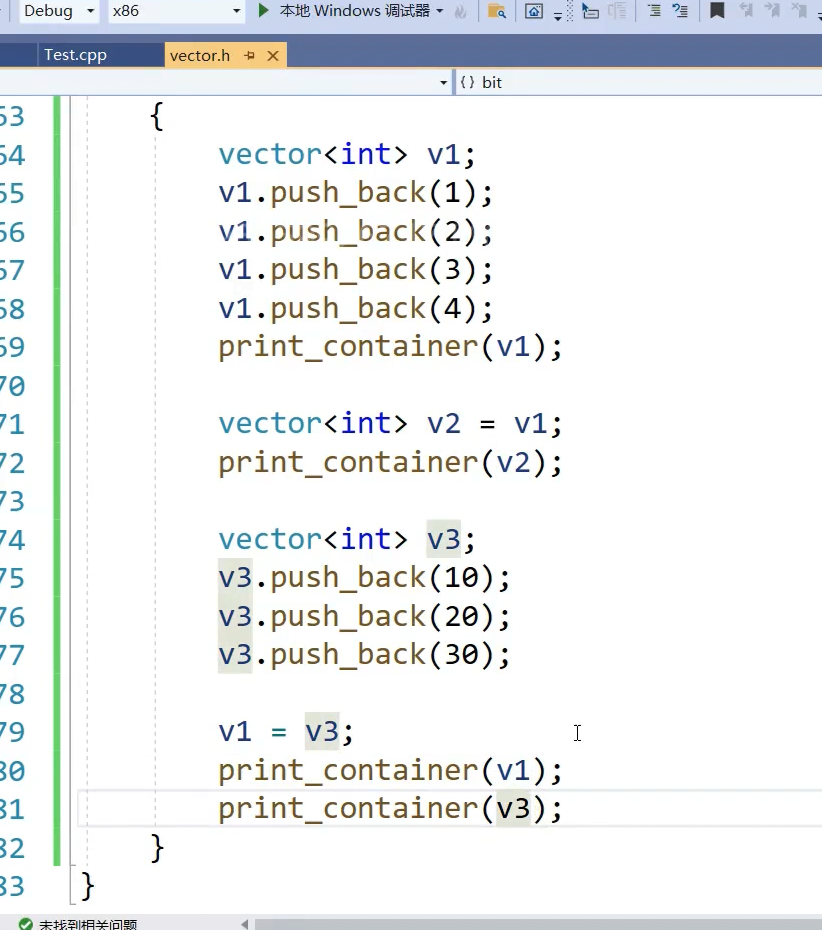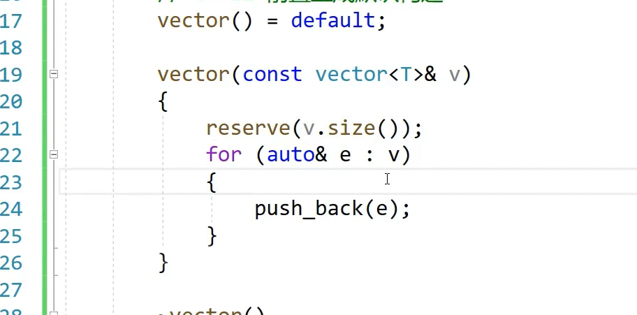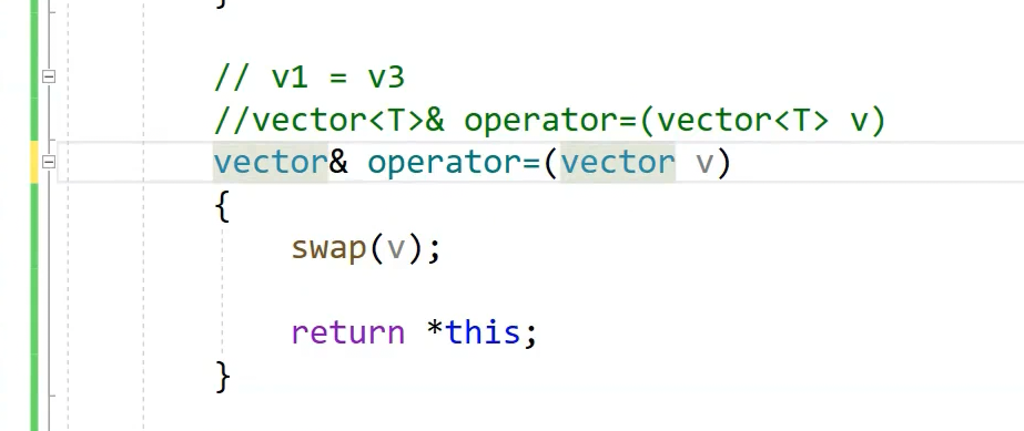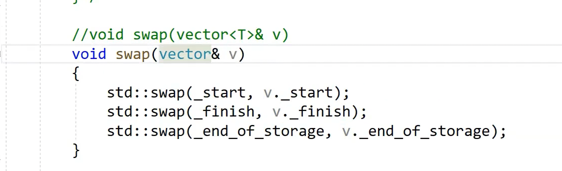 void swap(vector<T>& v){std::swap(_start, v._start);std::swap(_finish, v._finish);std::swap(_end_of_storage, v._end_of_storage);}void clear(){_finish = _start;}// v1 = v3/*vector<T>& operator=(const vector<T>& v){if (this != &v){clear();reserve(v.size());for (auto& e : v){push_back(e);}}return *this;}*/void swap(vector<T>& v){std::swap(_start, v._start);std::swap(_finish, v._finish);std::swap(_end_of_storage, v._end_of_storage);}// v1 = v3//vector& operator=(vector v)vector<T>& operator=(vector<T> v){swap(v);return *this;}reserve里有检查,相等或者小于就不会。