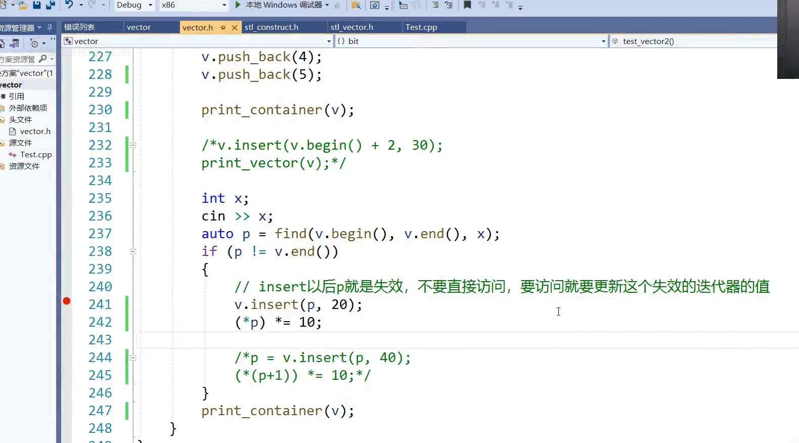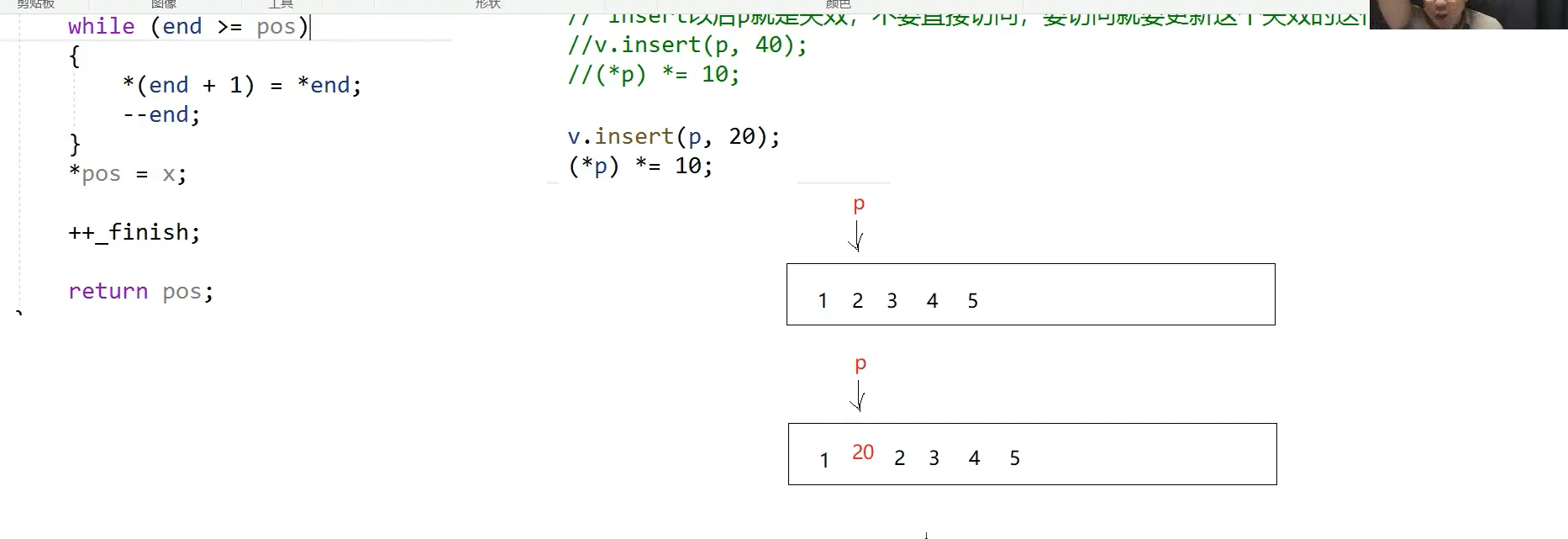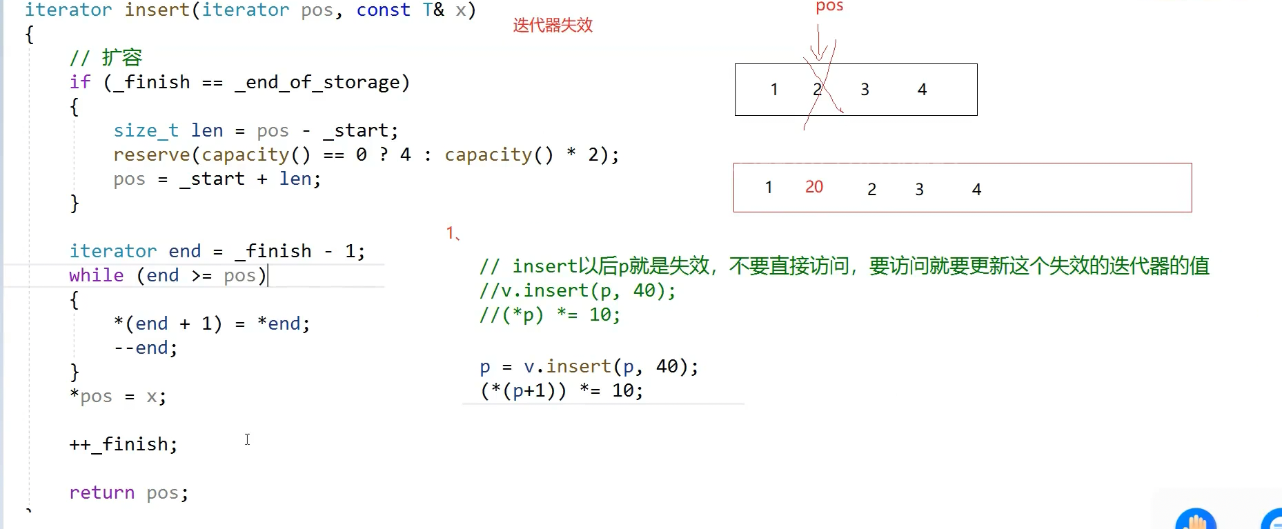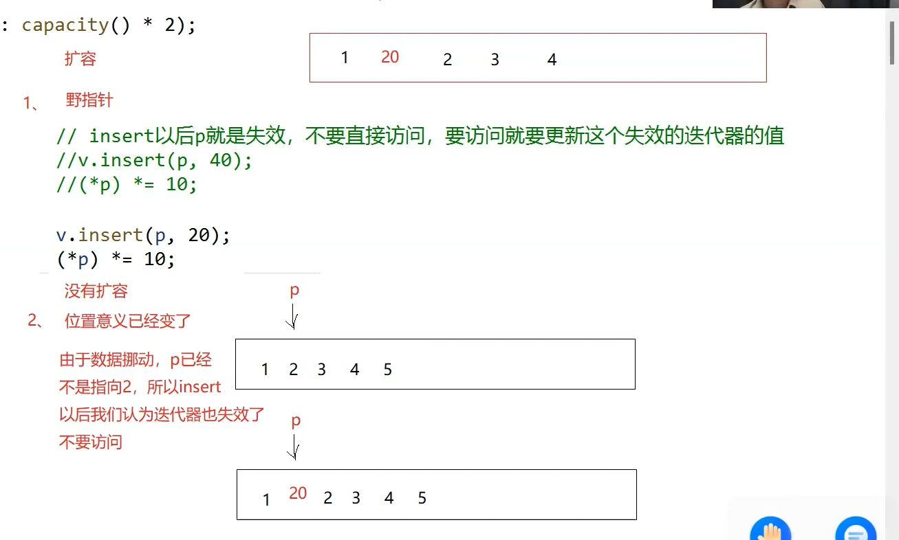 本来是想让2*=10,可是却让新插入的*=10;这也算迭代器失效。第一种是野指针,第二种是位置意义已经变了。第二种情况下次你怎么知道什么时候扩容,