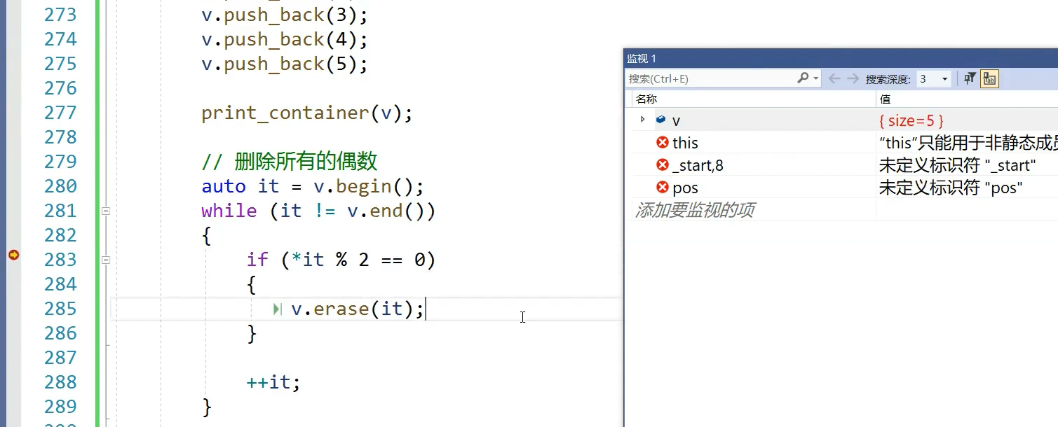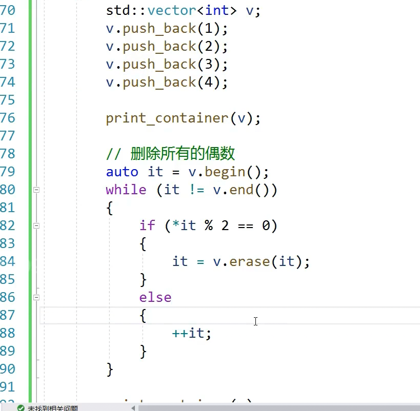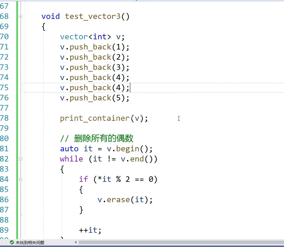 void test_vector3(){std::vector<int> v;v.push_back(1);v.push_back(2);v.push_back(3);v.push_back(4);print_container(v);// 删除所有的偶数auto it = v.begin();while (it != v.end()){if (*it % 2 == 0){it = v.erase(it);}else{++it;}}print_container(v);}